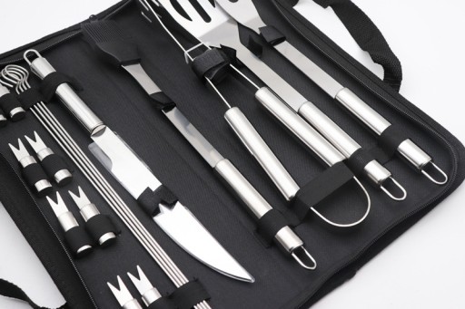Zestaw akcesoriów do grillowania, wykonany z wytrzymałej stali nierdzewnej, nie rdzewieje i długotrwały. Wyposażony w antypoślizgowe uchwyty ze stali nierdzewnej, aby zapewnić najbardziej komfortowe grillowanie.