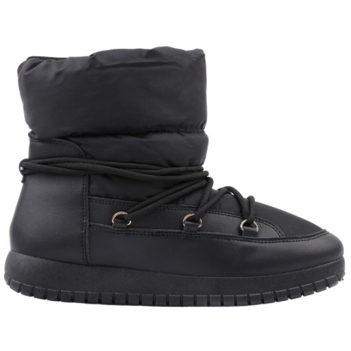 Śniegowce botki damskie na grubej, płaskiej podeszwie z zabezpieczającym bieżnikiem. Okrągły nosek, cholewka sięgająca za kostkę. Na cholewce poziome przeszycia a'la pikowanie. W górnej części cholewki znajduje się gumka. Wykonane z materiału, ocieplone.