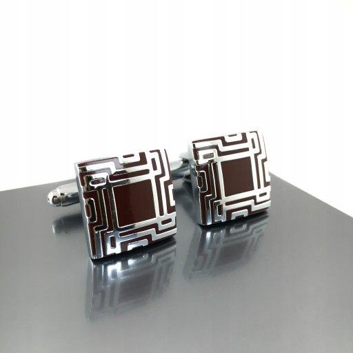 Efektowne spinki do mankietów łączące klasykę, tradycję i nowoczesny styl. Srebrno bordowa, polerowana górna część głowicy spinki. Bordowy motyw Grecki. Wykonana ze stali. Ten surowiec od lat jest materiałem dekoracyjnym stosowanym w męskiej biżuterii – fantastyczna gra ułożonego połączenia dwóch struktur górnej części spinki, przykuwa wzrok i podkreśla wyjątkowość całej konstrukcji tej stylizacji. Spinki do koszuli to idealny dodatek na wielkie uroczystości, np. ślub lub bankiet.