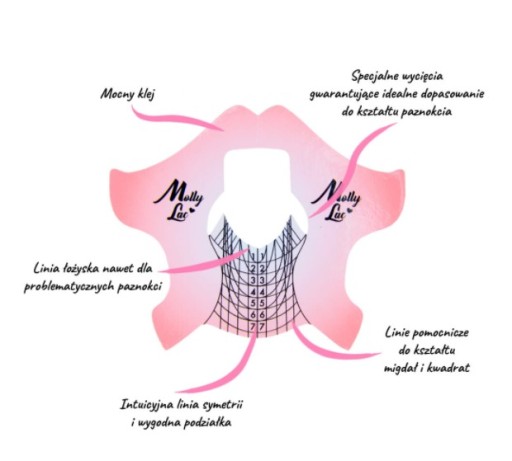 Formy idealnie przylegają do paznokcia, dzięki czemu pozbędziesz się problemu 'podlewania' żelu pod paznokieć co często prowadzi do nadłamań. Idealnie dobrany, mocny klej zapobiega rozklejaniu, ale nie powoduje podrażnień, przez co może być wykorzystany nawet do bardzo wrażliwych dłoni. Idealna technika podłożenia formy, ale i dobrze dopasowany szablon zagwarantują Ci wspólnie trwałość stylizacji!