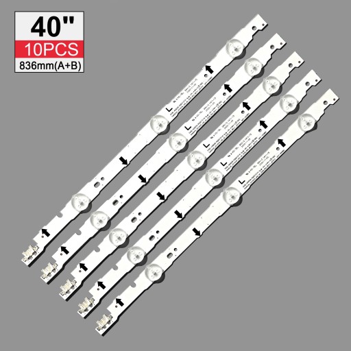 Nowy oryginalny 10 sztuk (5 * 3LED 5 * 6LED) UE40H6500 UE40H5500 podświetlenie LED bar D4GE-400DCA-R1 R2 D4GE-400DCB-R1 R2 30449A 30450A Wiele modeli telewizyjnych używa różnych zestawów listwy LED. Proszę dopasować paski pokazane na zdjęciu do oryginałów w telewizorze przed złożeniem zamówienia. Jeśli nie masz pewności, czy jest kompatybilny, możesz włączyć wnętrze telewizora, zrobić zdjęcie i je do mnie. Dziękuję bardzoOryginalny nowyRozmiar (długość):836mm(A B)Liczba kulek LED:9 na pasekKażde napięcie lampy LED:3VPakiet obejmuje:1 zestaw = 10 sztuk (5 * A 5 * B) taśmy LEDPaski podświetlenia LED mają dużo zapasów, jeśli chcesz kupić luzem, suj się ze mną.