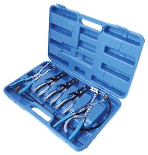 Specjalistyczny zestaw szczypiec do obejm samozaciskowych składający się z 5 elementów: