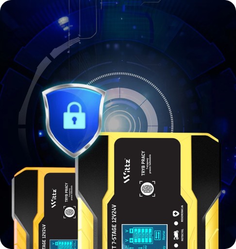 Wbudowane zabezpieczenia obwodów przed odwrotną polaryzacją, iskrami, przeładowaniem, przeciążeniem, przerwami, zwarciami i przegrzaniem. Ekran LCD zapewnia wizualną informację zwrotną o stanie naładowania i informacje diagnostyczne.