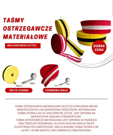 Taśma ostrzegawcza materiałowa służy do oznaczenia miejsc niebezpiecznych lub odgrodzenia przestrzeni. Materiałowa taśma pozwala na jej wielokrotne użycie.Jest odporna na niekorzystne warunki atmosferyczne.