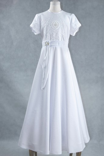 Sukienka uszyta jest ze śnieżnobiałej tkaniny komunijnej gabardyna-strecz .