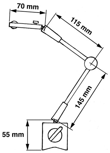 Z mechanizmem ustawiania dokładnego w górnym uchwycie. Otwór na osadzenie czujnika zegarowego, oraz rowek trapezowy do czujnika wychylnego dźwigniowego. Centralne blokowanie z pokrętłem dla dolnego, środkowego i górnego przegubu. Podstawa magnetyczna z rowkiem pryzmatycznym od spodu. Dostarczany bez czujnika.