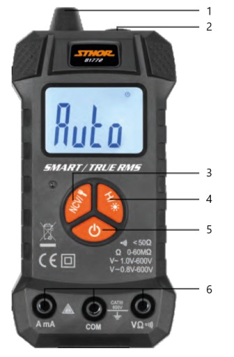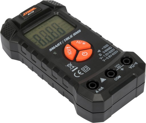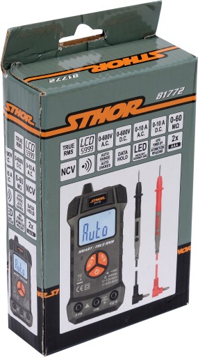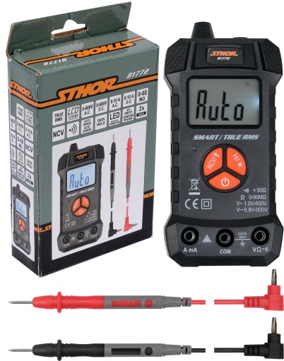 Miernik uniwersalny smart marki STHOR o symbolu 81772 z funkcją TRUE RMS oraz z automatycznym zakresem dla każdego pomiaru.