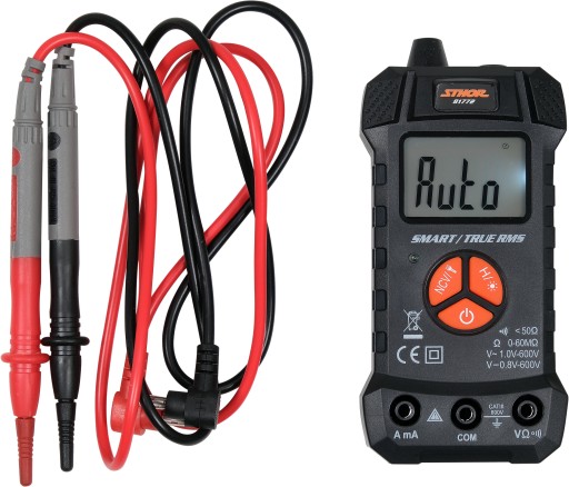 Miernik uniwersalny smart marki STHOR o symbolu 81772 z funkcją TRUE RMS oraz z automatycznym zakresem dla każdego pomiaru.