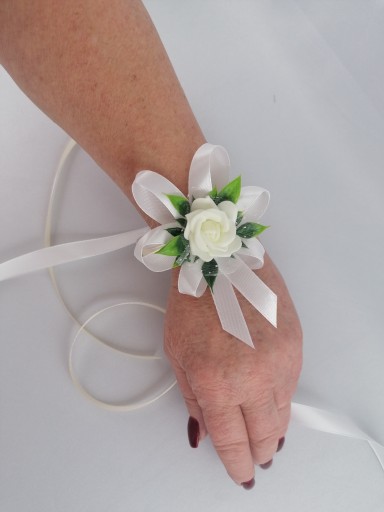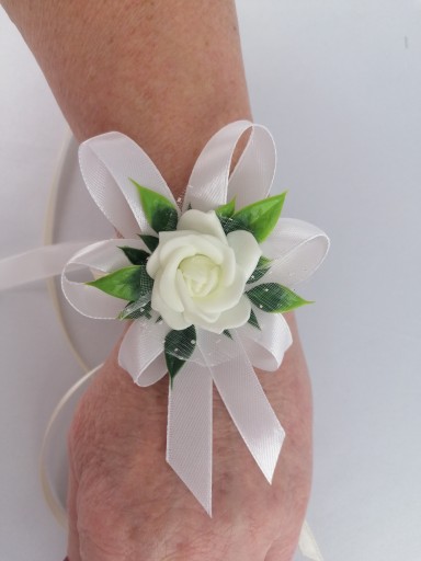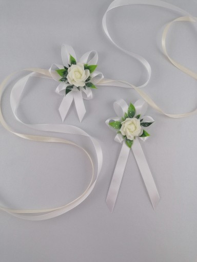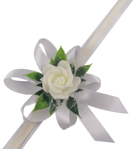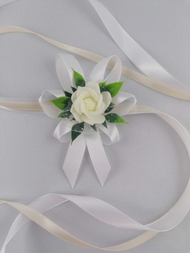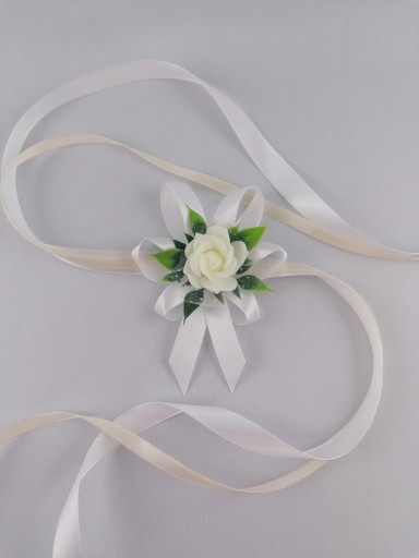 - kwiat w kolorze kremowym upięty na satynowych tasiemkach /12 i 6 mm biała, krem/