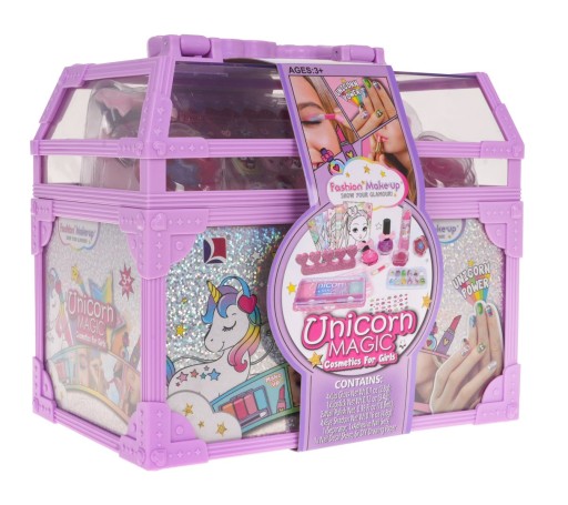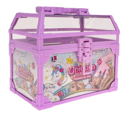 Zestaw kosmetyków w szkatułce z jednorożcem, to propozycja dla dzieci od 3-go roku życia. Duża pojemna szkatułka - kuferek z rączką do przenoszenia pomieści wszystkie kosmetyki małej modnisi. Zestaw składa się z wielu kosmetyków, bezpiecznych dla dziecka. Uwaga tylko u nas w zestawie znajdują się dodatkowe elementy takie jak: pomadka do ust, cztery cienie do powiek z pędzelkiem, błyszczyk do ust w tubce, lakier do paznokci, trzy błyszczyki do ust w okrągłym opakowaniu, aplikacje w kształcie serduszka i dwa opakowania brokatów.