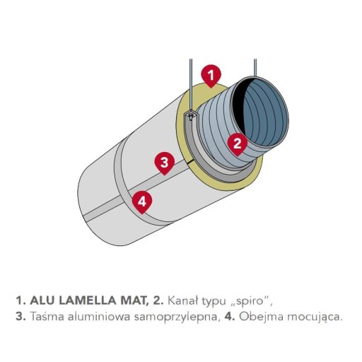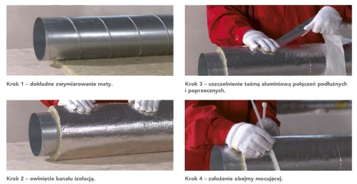 ✔ W przypadku kanałów o przekroju okrągłym (gładkich lub spiro) kanał owija się odpowiednio zwymiarowaną matą KLIMAMAT / ALU LAMELLA MAT, a następnie wszystkie połączenia skleja się aluminiową taśmą samoprzylepną. Połączenia klejone należy wzmocnić obejmą mocującą lub drutem stalowym. Poszczególne etapy montażu przedstawiają fotografie poniżej.
