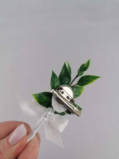Kotylion mocowany jest na metalowej zapince posiadającej klips i agrafkę.