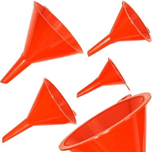 Zestaw 4 uniwersalnych lejków z tworzywa sztucznego o różnych średnicach (52, 75, 95, 115 mm). Przydatny w domu, garażu i warsztacie.