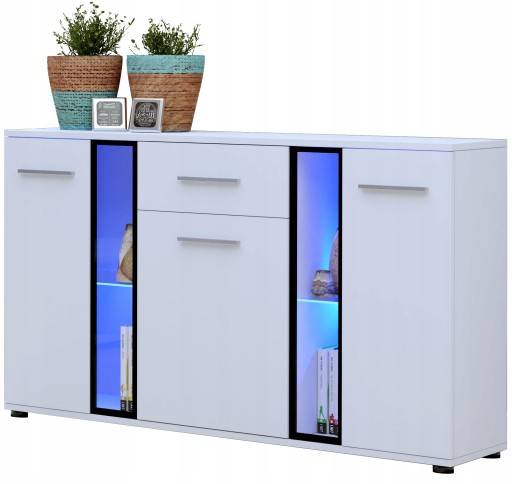 Zestaw składająca się z dwóch wysokich witryn, komody oraz ławy. Jedna z witryn wyposażona została w drążek na wieszaki i półki z możliwością podświetlenia, a druga w cztery półki z płyty wiórowej oraz szklane półki, które również można podświetlić oświetleniem led. Zestaw wkomponuje się doskonale w każde z wnętrz salonu. Meble wykonywane są z płyty dwustronnie laminowanej o grubości 16 mm, charakteryzującej się dużą wytrzymałością na uszkodzenia mechaniczne.