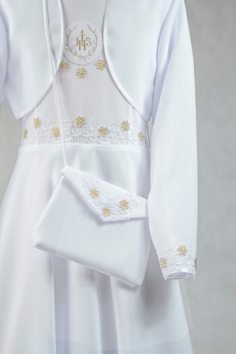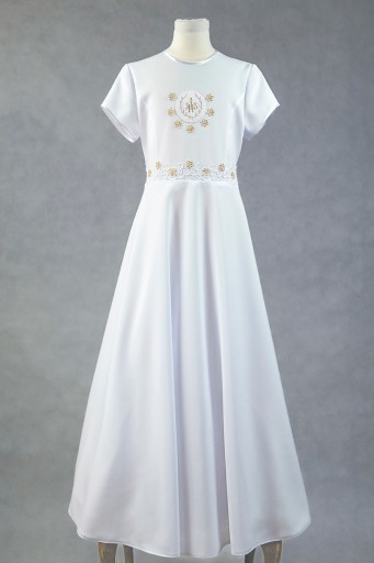 Sukienka uszyta jest ze śnieżnobiałej tkaniny komunijnej gabardyna-strecz .