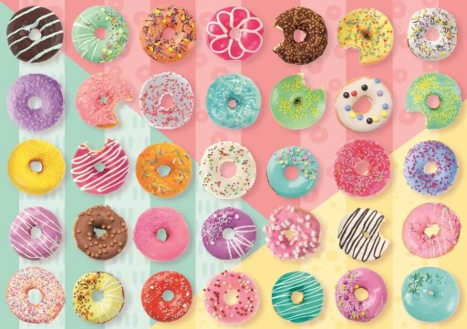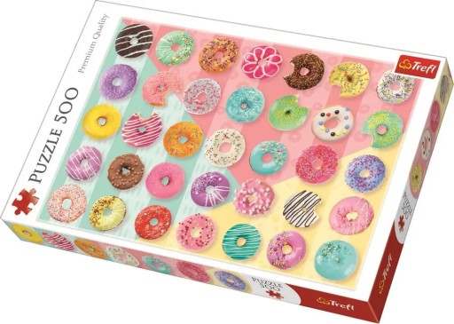 Puzzle składające się z 500 elementów przedstawiające smakowite, kolorowe donaty. Po ułożeniu powstanie obrazek o wymiarach 58.0 x 34.0 cm. Produkt został wykonany z wysokiej jakości materiałów, z zastosowaniem specjalnego kalandrowanego papieru odbijającego światło, co ułatwia układanie. Produkt został wyprodukowany w Polsce, a do produkcji zostały użyte materiały ekologiczne.