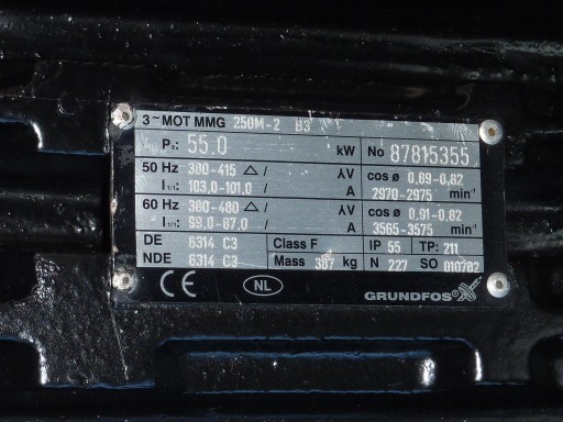 W tym ogłoszeniu mam do zaoferowania używany silnik firmy Grundfos o mocy 55kW na 2970obr/min (wyprodukowany w Holandii). Wielkość mechaniczna 250, 3~400VAC - trójkąt, praca ciągła - S1. Średnica osi 60mm, wznios 250mm, waga 387kg. Środki otworów montażowych wzdłuż osi 349mm a w poprzek osi 406mm. Silnik jest w bardzo dobrym stanie, w pełni sprawny, gotowy do pracy. Uzwojenie oryginale, nie przegrzane. Zostały założone nowe łożyska (NTN 6314 C3 - duże łożyska). Zewnętrzne smarowanie łożysk. Silnik jest solidnie wykonany, obudowa żeliwna. Silnik pracował w zestawie z pompą Grundfos.
