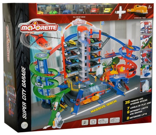 Garaż Super City został stworzony przez powszechnie znaną i cenioną firmę Majorette. W skład tego fantastycznego zestawu wchodzi 7-poziomowy garaż oraz 26 samochodów i lokomotywa z wagonem.