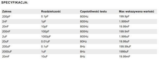 - Typowy pobór prądu 3~4mA (zakres 200pF~200uF)
