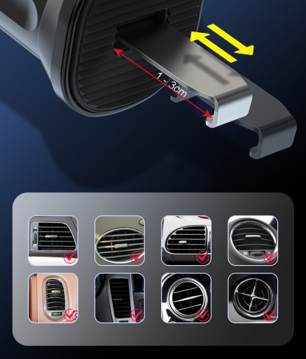 Dzieki wysuwanemu metalowemu zaczepowie produkt współpracuje z większością istniejących samochodowych kratek wentylacyjnych. Jego długość można regulować zakresie 1-3cm.