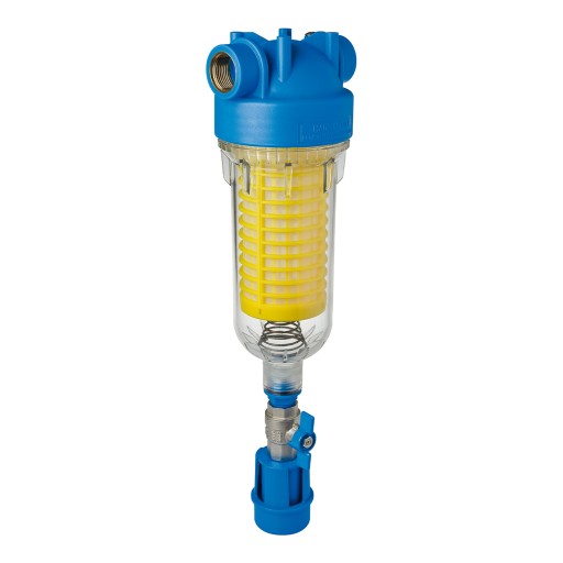 Zawór spustowy zmienia kierunek wody, dzięki czemu dochodzi do oczyszczenia wkładu z zanieczyszczeń. Zestaw zawiera wkład RLH 90 mikronów, klucz oraz uchwyt ścienny.