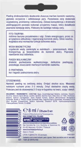 Roślinna tauryna pozyskiwana z algi działa energizująco, przez co przyspiesza odbudowę i regenerację komórek skóry, ale również silnie nawilża, wygładza oraz wzmacnia funkcje ochronne naskórka. Formuła z cząteczkami zamkniętymi w nośnikach – polarosomach, które transportują ją bezpośrednio do komórek skóry, pozostawia cerę doskonale promienną i odświeżoną. Drobinki piasku pochodzenia wulkanicznego, delikatnie złuszczają martwe komórki naskórka i poprawiają kondycję skóry. Nawet najdrobniejsze podrażnienia skóry ukoi d-panthenol, który dopełnia skład peelingu.