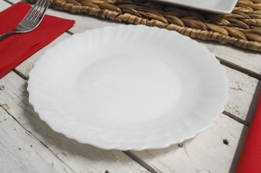 Biały talerz deserowy o średnicy 19 cm z serii Feston, francuskiej firmy Luminarc. Linia Feston to śnieżnobiałe szkło hartowane z lekkim, falowanym zdobieniem na brzegach talerza. Talerz świetnie sprawdzi się do serwowania na nim ciasta, deserów lub drobniejszych dań.