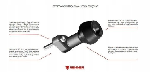 Crash pady mają konstrukcję dwustrefową ? strefa zewnętrzna absorbuje energię uderzenia i zgina się w ściśle określonym punkcie. Część wewnętrzna to właściwe mocowanie do oryginalnych elementów motocykla ? ramy lub bloku silnika. Wytrzymałość śrub i ich gwintów jest tak dobrana, żeby nie spowodować urwania gwintu lub wygięcia ramy motocykla w chwili uderzenia.
