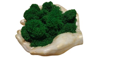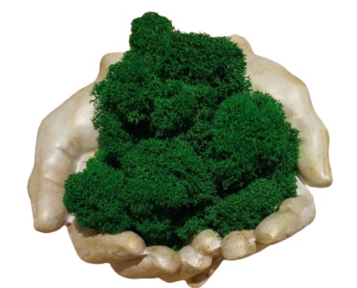 W ostatnich latach produkty z dodatkiem mchu dominują jako dodatki do naszych wnętrz. Możesz je spotkać w domach, biurach, urzędach, restauracjach. Wychodząc na przeciw Państwa oczekiwaniom przygotowaliśmy betonową doniczkę w kształcie dłoni wypełnioną chrobotkiem. Dłonie zostały pokryte farbą patynująca w kolorze złotym. Z uwagi na to, że mech jest produktem naturalnym to ułożenie go w każdej kompozycji będzie inne. Możemy jednak Państwu obiecać, że dołożymy starań aby ilość użytego chrobotka była w każdej kompozycji podobna.