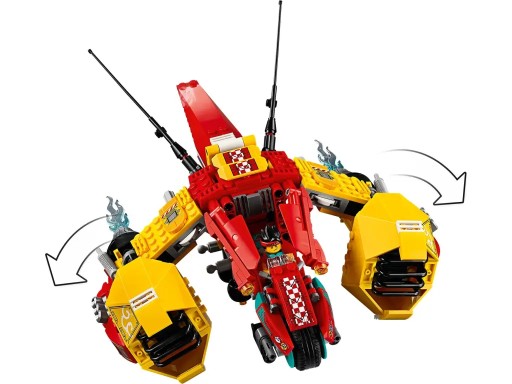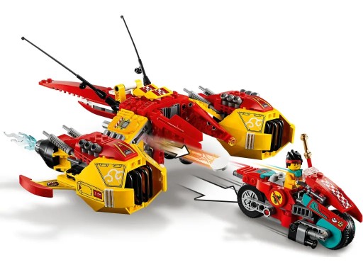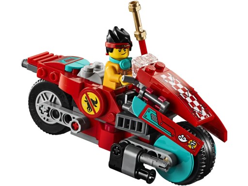 - Odrzutowiec ma ruchome skrzydła z dwoma miotaczami dysków, wielki podwójny silnik odrzutowy oraz kokpit dla minifigurki Monkie Kida, który po odłączeniu zmienia się w motocykl LEGO® i pozwala przenieść walkę na ziemię.