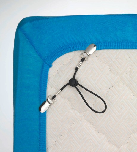 Produkty nadają się do wszystkich prześcieradeł, zarówno tych z gumką, jak i bez. Prosty i sprytny mechanizm wystarczy umieścić w rogu pod materacem, a następnie włożyć w uchwyt końcówkę prześcieradła. Czynność należy powtórzyć z wszystkich czterech stron. Idealne napięcie materiału gwarantują dodatkowo klipsy blokujące, których oddalenie można regulować za pomocą niewielkiego, czarnego przycisku.