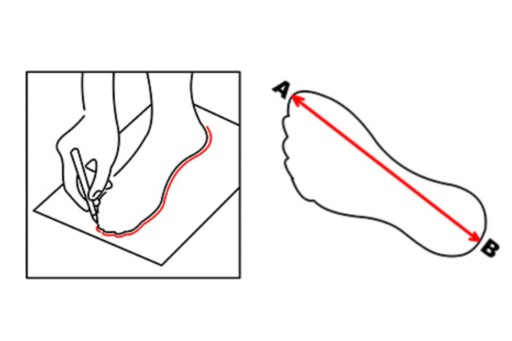 - Zmierz odległość pomiędzy dwoma najbardziej wysuniętymi końcami obrysowanej stopy (A i B). To samo zrób z drugą stopą