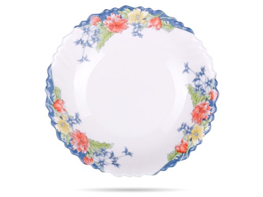 Głęboki talerz obiadowy z serii Florine. Świetnie sprawdzi się do serwowania takich dań jak zupy czy kremy. Wykonany z mocnego szkła hartowanego - dzięki temu jest wyjątkowo mocny i lekki. Zdobiony subtelnym, kwiatowym motywem. Brzegi delikatnie falowane, powierzchnia idealnie gładka, łatwa w utrzymaniu czystości.
