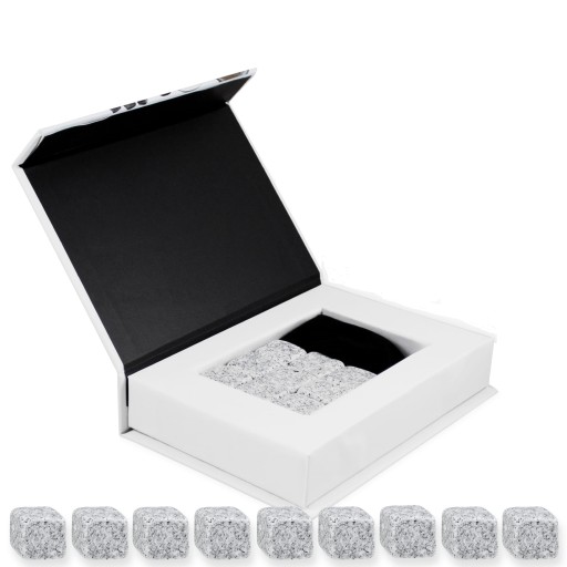 Zestaw do schłodzenia trunków zawierający 9 sztuk kostek o wymiarach 2 cm. Zestaw wykonany z granitu, plus woreczek, opakowanie do przechowania.