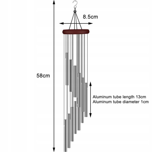5. Wymiary: Całkowita długość dzwonka od haka do końca wynosi 58 cm, a górna średnica 8,5 cm. Jest 12 pięknych aluminiowych rur tuningowych o długości 13 cm.