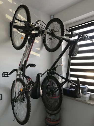 Wieszak umożliwia wieszanie roweru na ścianie za obręcz przedniego koła. Minimalizuje miejsce potrzebne do przechowywania roweru.