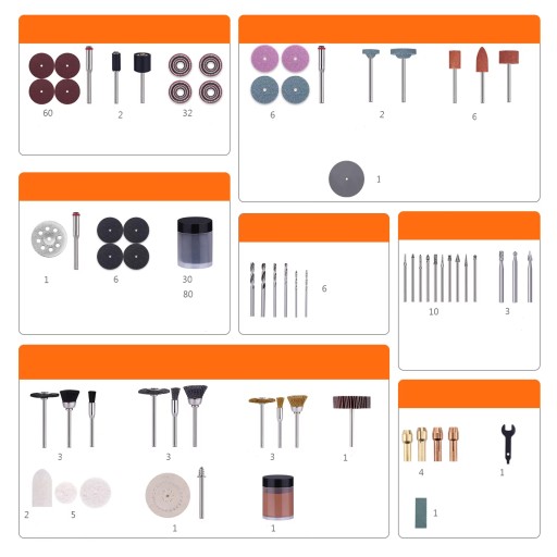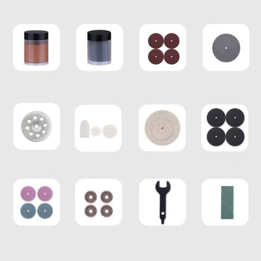 + W zestawie znajdują się dodatkowe akcesoria - n.in. kółka tekstylne do polerowania biżuterii, szkła i jadeitu, kółka ścierne do polerowania i usuwania ciężkich materiałów oraz tarcze diamentowe do cięcia jadeitu i cienkich płyt żelaznych.