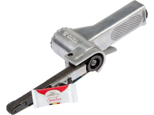Zawartość zestawu: szlifierka pneumatyczna taśmowa, złącze do węża, taśma szlifierska x3 (P60, P80, P120)