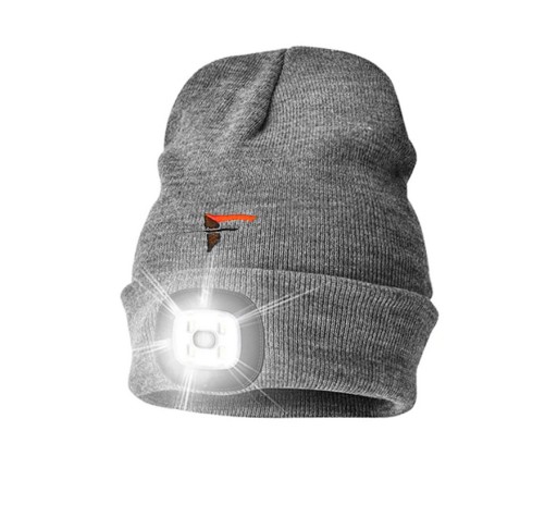 Czapka zimowa w kolorze szarym wyposażona jest w lampkę LED o mocy światła 250 lumenów z wbudowanym akumulatorem.