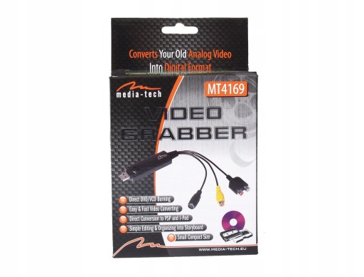 VIDEO GRABBER MT4169 to urządzenie do przechwytywania i konwersji analogowego sygnału audio/video np. z VHS do formatu VCD, DVD z każdego urządzenia, wyposażonego w analogowe wyjście wideo, np.: magnetowidu, kamery, itp. , do postaci cyfrowej.