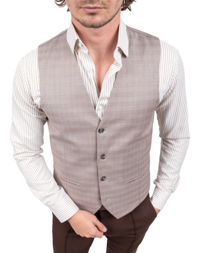 Męska Kamizelka Beżowa Kratka Casual Elegancka + poszetka i mucha- 58