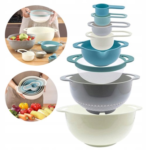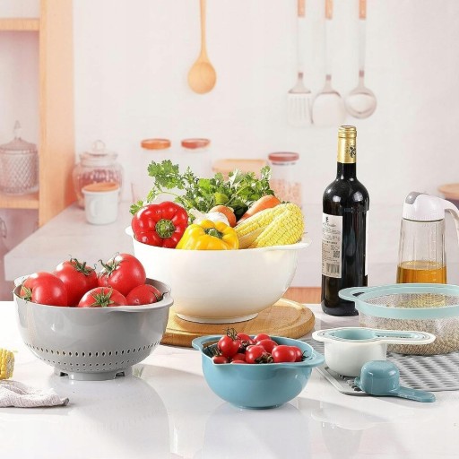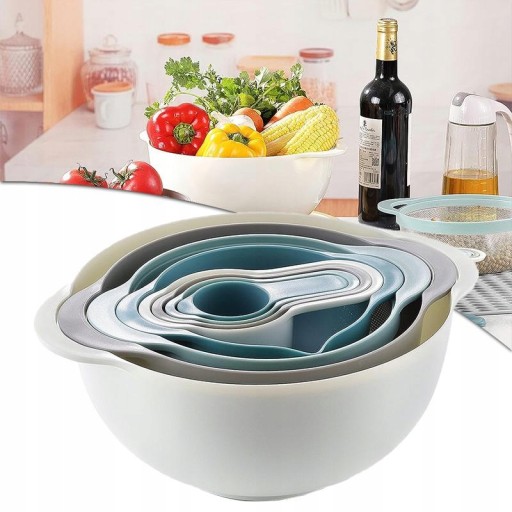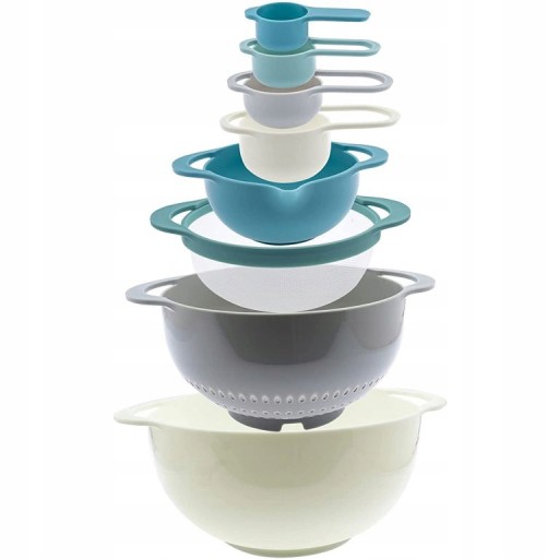 Praktyczny zestaw kuchenny składający się z 2 misek do mieszania lub miksowania, durszlaka, sitka z drobymi oczkami oraz 4 miarek różnej wielkości. Mniejsza miska posiada dzióbek, który ułatwia przelewanie płynnych składników. Miarkami idealnie odmierzymy sypkie lub płynne produkty.