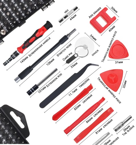 - uniwersalny komplet narzędzi, do użytku domowego oraz komercyjnego, przydatny do naprawy smartfonów, komputerów PC i innych