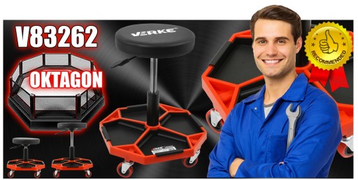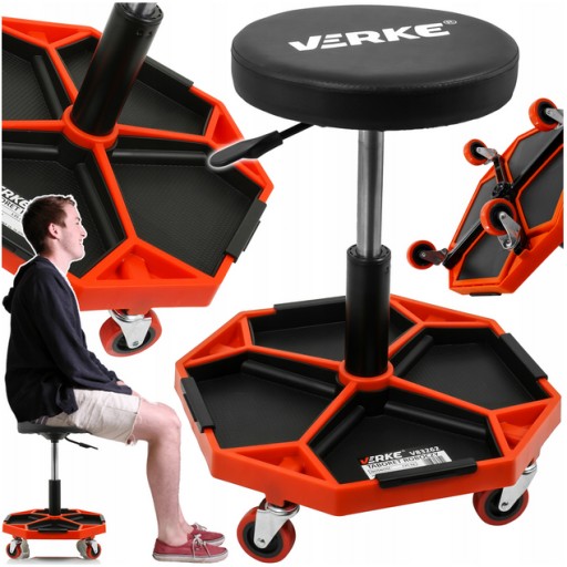 Taboret warsztatowy firmy Verke zaprojektowano do użytku w profesjonalnych warsztatach, serwisach samochodowych, zakładach naprawczych, a także świetnie się sprawdzi w przydomowym garażu. Posiada obrotowe siedzisko oraz 4 kółka skrętne, które zwiększają jego mobilność. Praktycznym rozwiązaniem jest wyposażenie go w dużą półkę, gdzie mechanik może umieścić wykorzystywane podczas wykonywanych prac przybory. Powłoka komfortowego siedziska została wykonana z PVC. Dzięki pneumatycznej regulacji wysokości da się go łatwo dostosować do wzrostu danej osoby.