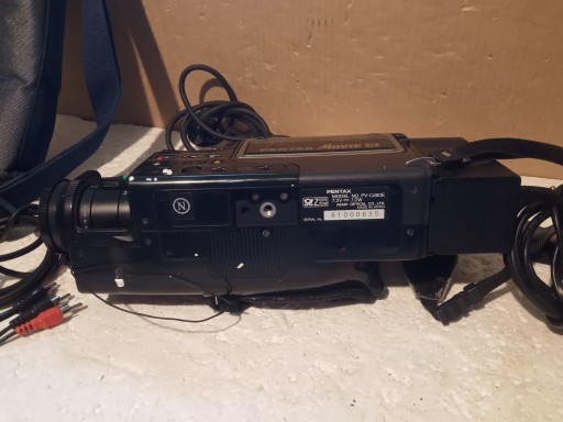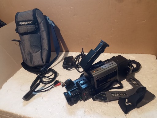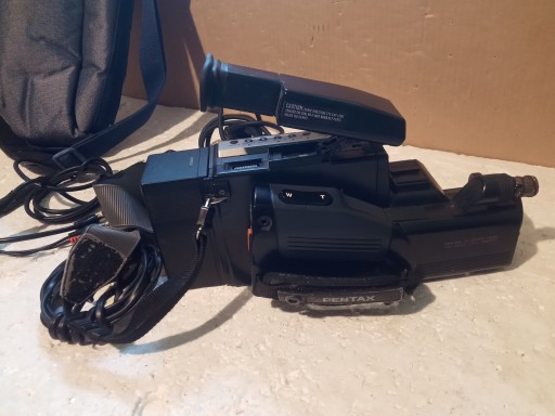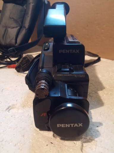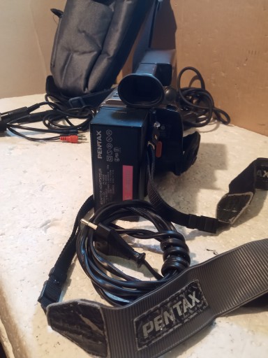 Kamera : PENTAX PV-C880E ( Po podłączeniu zailania częściow słychać , że kamera się załącza ale w wizjerze nie widać obrazu , nie odtwarza , kaseta w środku !! )e ładowarką oraz torba i kable oraz konwerter .