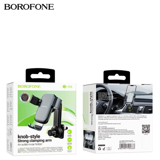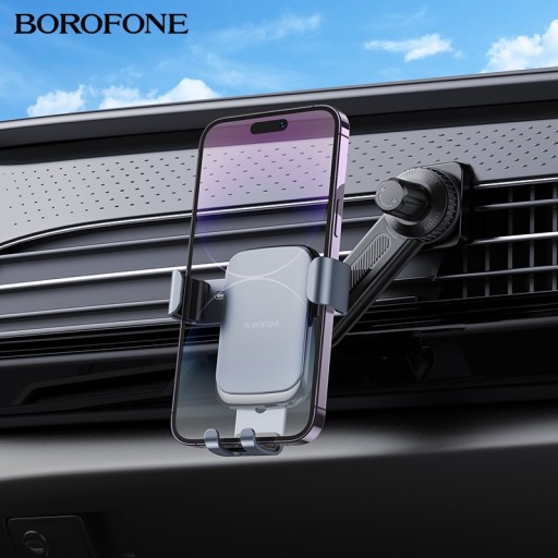 BOROFONE BH94 Warrior to samochodowy uchwyt grawitacyjny do telefonu / na telefon, z przeznaczeniem do montażu na kratkę wentylacyjną / do kratki wentylacyjnej pojazdu, wyposażony w regulowaną głowicę, dającą duże możliwości regulacji i dostosowania do własnych potrzeb kierowcy oraz przegub kulowy, mocowany za ramienia z dociskiem, przeznaczony do telefonów komórkowych / smartfonów lub tabletów o wadze nie większej niż 0,5 kg i wielkości wyświetlacza od 4.5 do 7 cali.