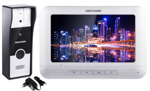 Zestaw wideodomofonowy marki Hikvision z bramofonem montowanym w obudowie natynkowej oraz 7" kolorowym ekranem LCD FullHD. Zestaw nie wymaga dodatkowej konfiguracji (po podłączeniu według schematu urządzenie jest gotowe do pracy).