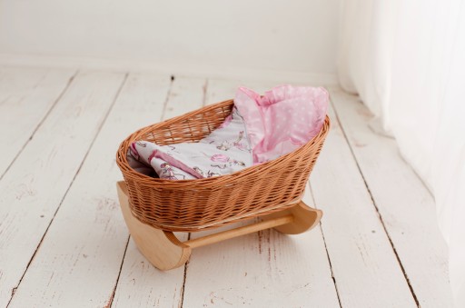 Wiklinowa kołyska z rożkiem i materacykiem. Idealna do zabawy w odgrywanie ról.