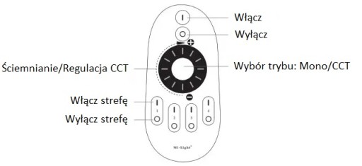 PILOT Mi-Light to pilot przeznaczony do obsługi wszystkich produktów z serii White (jednokolorowych). Pilot pracuje w systemie 4-strefowym. Do każdej strefy można przypisać dowolną ilość produktów. Pilot umożliwia płyną regulację jasności oraz temperatury barwowej światła białego za pomocą obrotowego pokrętła. Pilot jest zasilany bateriami 2 x AAA.