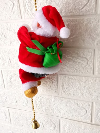 Elektryczna animowana wspinaczka Święty Mikołaj może wspinać się po linie i wielokrotnie schodzić w dół przy muzyce, z wesołym wyrazem twarzy i mini workiem na plecach.